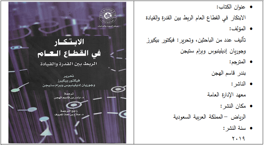 كتابنا هذا هو النسخة العربية من كتاب Innovation in the Public Sector Linking Capacity and Leadership ، تأليف عدد من الباحثين، وتحرير فيكتور بيكيرز وجوريان إديلينبوس وبرام ستيجن، وترجمة بندر قاسم الهجن، ونشر معهد الإدارة العامة بالمملكة العربية السعودية.